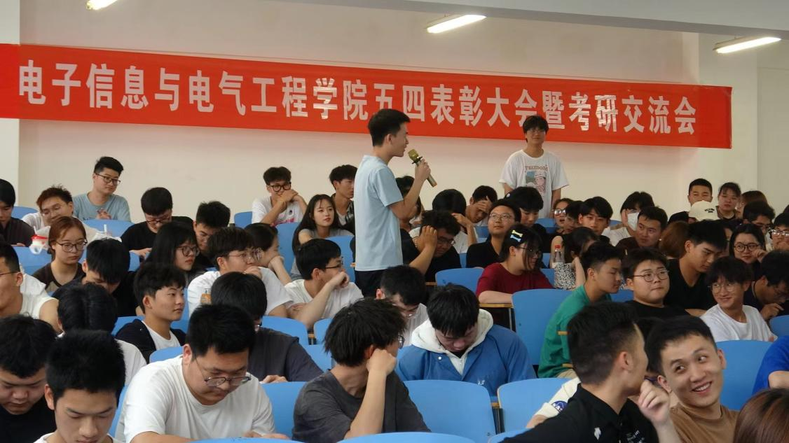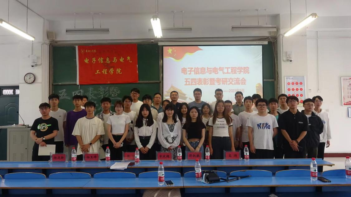 为更好的鼓舞同学们,表彰为学院工作做出贡献的优秀青年学生,电气学院于5月31日在A19-203举办了“2023年五四表彰大会暨考研交流会”。参会人员有党总支副书记张涵、团总支书记申庆超、各专业辅导员老师、考研优秀学生代表、2020级、2021级和2022级优秀学生代表,共计200余人。
