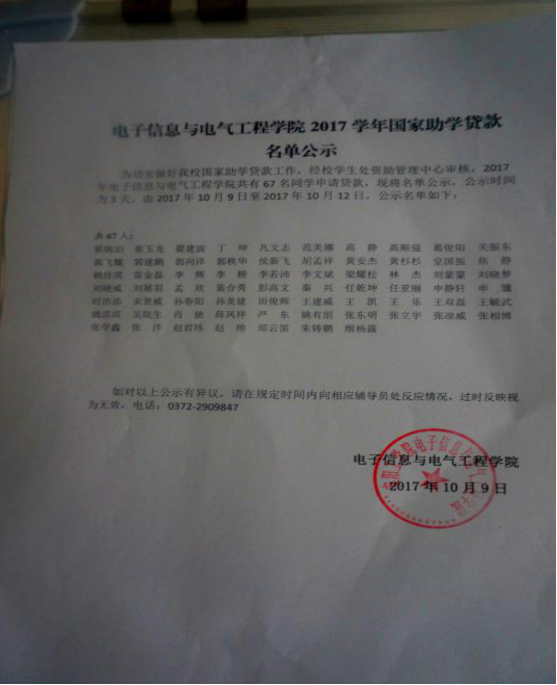 为切实做好我校国家助学贷款工作,经校学生处资助管理中心审核,2017年电气学院共有67名同学申请贷款,现将名单公示,公示时间为3天,由2017年10月9日至2017年10月12日,公示名单如下: