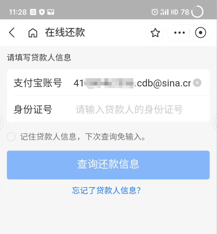 2.输入还款的支付宝账户,注意该账户为助学贷款系统中的账户,在学生在线服务系统中查看:
