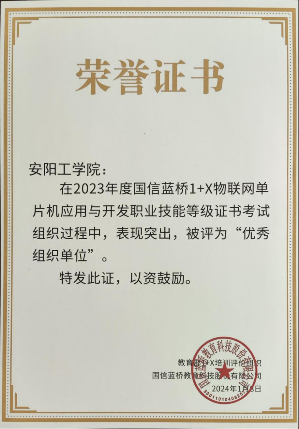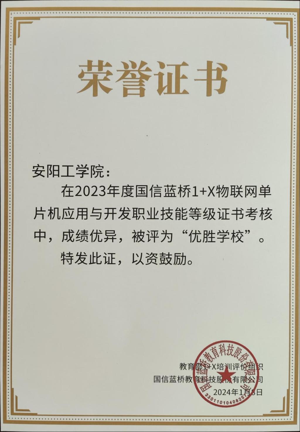 近日,我校被教育部1+X培训评价组织国信蓝桥教育科技股份有限公司评选为2023年度国信蓝桥“1+X”物联网单片机应用与开发职业技能等级证书“优秀组织单位”和“优胜学校”,我院高素玲老师和李小芹老师获得“优秀指导教师”称号。