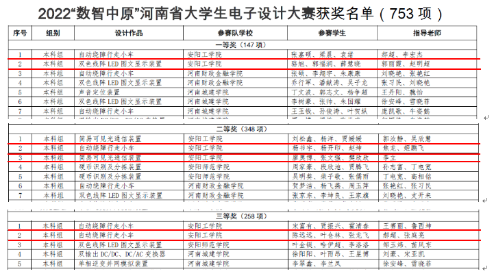 近日,河南省教育厅公布了2022“数智中原”河南省大学生电子设计大赛结果,我院获得一等奖2项、二等奖3项、三等奖2项。
