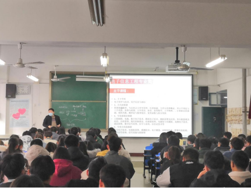 高素玲以“学业-专业-职业”为主题,向学生介绍了电子信息工程专业的专业优势、办学特色、就业方向、培养目标、学业路径、职业规划等,并组织学生填写调查问卷。张庭亮从“学科竞赛”的视角介绍了电子信息工程专业的优势和特色。