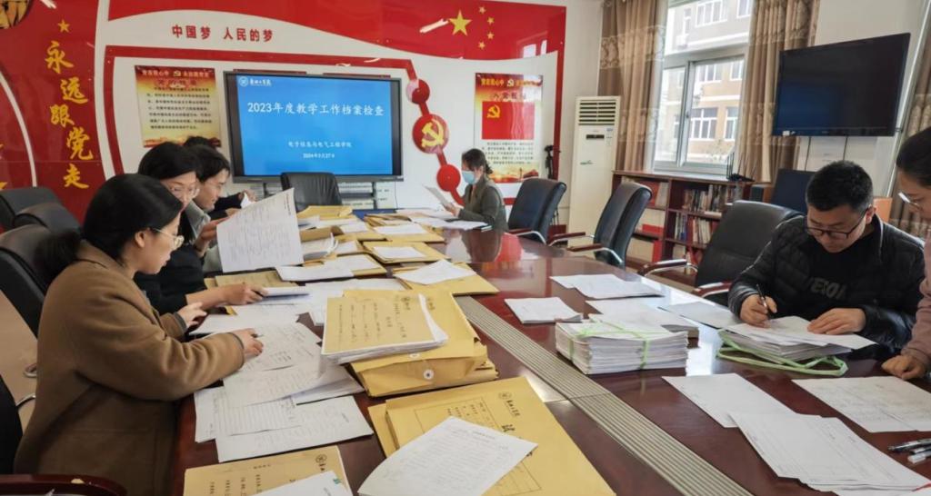 为提升本科教育教学质量,扎实做好教学日常管理和质量监控工作,进一步完善教学档案材料管理,电气学院成立教学工作档案检查工作小组,副院长段德功任组长,成员包括教研室主任和骨干教师代表。3月27日上午,工作小组在A-07 308对学院2023年度教学工作档案进行检查。